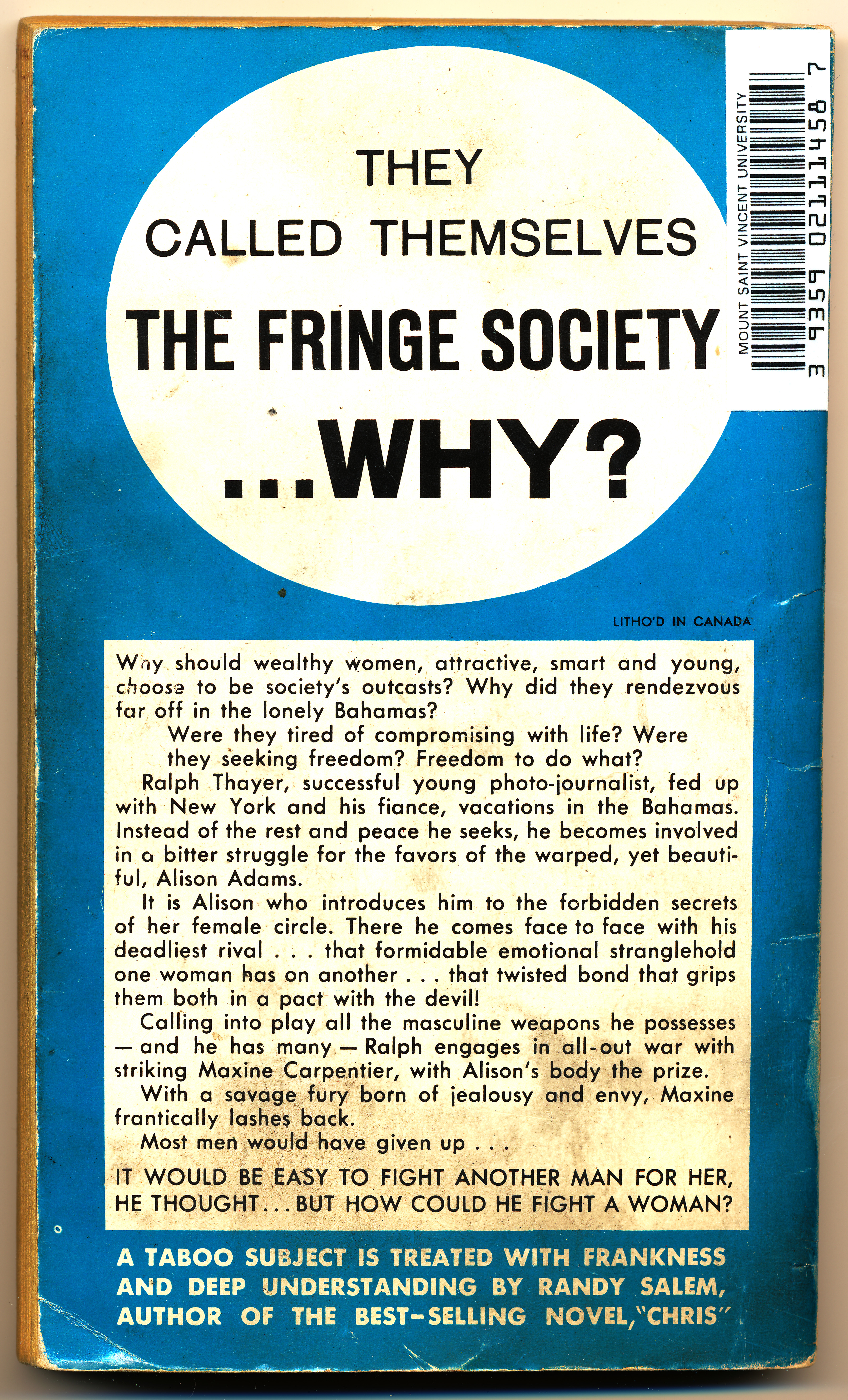 | dc.description | "They called themselves the fringe society...why? Why should wealthy women, attractive, smart and young, choose to be society's outcasts? Why did they rendezvous far off in the lonely Bahamas? Were they tired of compromising with life? Were they seeking freedom? Freedom to do what? Ralph Taylor, successful young photo-journalist, fed up with New York and his fiance, vacations in the Bahamas. Instead of the rest and peace he seeks, he becomes involved in a bitter struggle for the favors of the warped, yet beautiful, Alison Adams. It is Alison who introduces him to the forbidden secrets of her female circle. There he comes face to face with his deadliest rival...that formidable emotional stranglehold one woman has on another...that twisted bond that grips them both in a pact with the devil! Calling in to play all the masculine weapons he possesses - and he has many - Ralph engages in all-out war with striking Maxine Carpenter, with Alison's body for the prize. With a savage fury born of jealousy and envy, Maxine frantically lashes back. Most men would have given up... It would be easy to fight another man for her, he thought...but how could he fight a woman? A taboo subject is treated with frankess and deep understanding by Randy Salem, author of the best-selling novel, 'Chris'" -Back cover | |