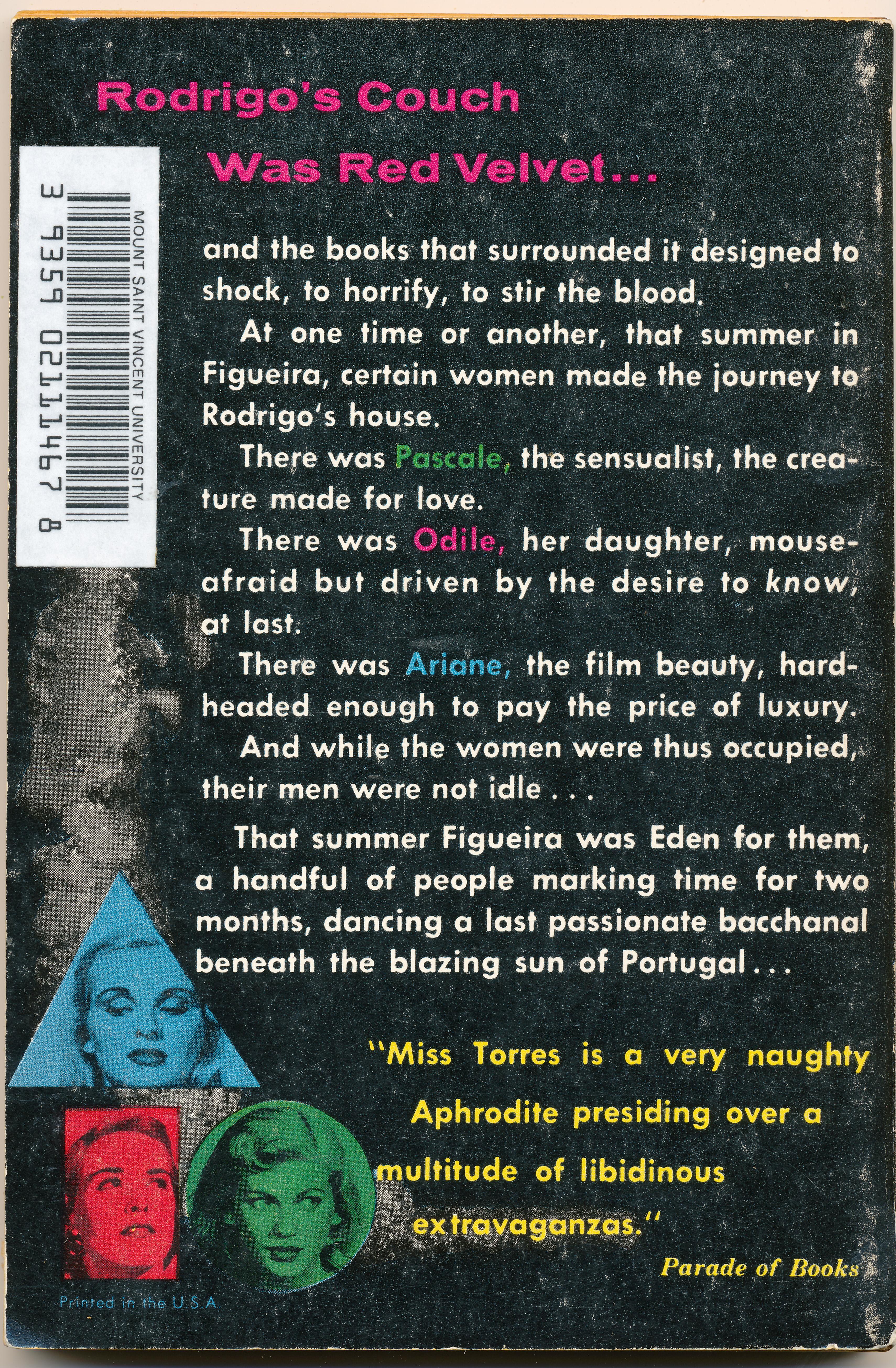 "Rodrigo's couch was red velvet...and the books that surrounded it designed to shock, to horrify, to stir the blood. At one time or another, that summer in Figueira, certain women made the journey to Rodrigo's house. There was Pascale, the sensualist, the creature made for love. There was Odile, her daughter, mouse-afraid but driven by the desire to know, at last. There was Ariane, the film beauty, hard-headed enough to pay the price of luxury. And while the women were thus occupied, their men were not idle...That summer Figueira was Eden for them, a handful of people marking time for two months, dancing a last passionate bacchanal beneath the blazing sun of Portugal...'Miss Torres is a very naughty Aphrodite presiding over a multitude of libidinous extravaganzas.'-Parade of Books" -Back cover