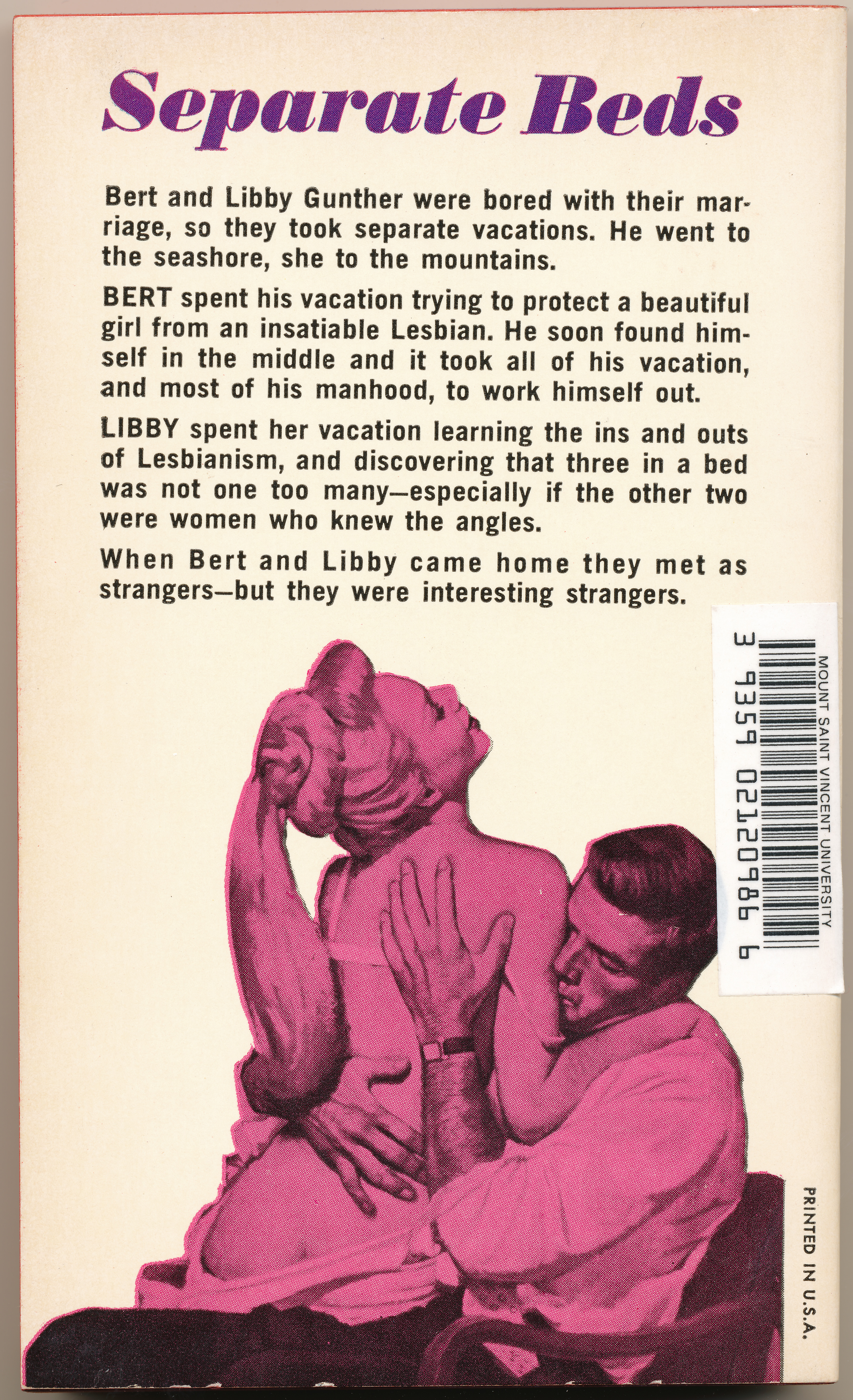 "SEPARATE BEDS. Bert and Libby Gunther wer bored with their marriage, so they took separate vacations. He went to the seashore, she to the mountains. BERT spent his vacation trying to protect a beautiful girl from an insatiable Lesbian. He soon found himself in the middle and it took all of his vacation, and most of his manhood, to work himself out. LIBBY spent her vacation learning the ins and outs of Lesbianism, and discovering that three in a bed was not one too many - especially if the other two were women who knew the angles. When Bert and Libby came home they met as strangers - but they were interesting strangers." -Back cover