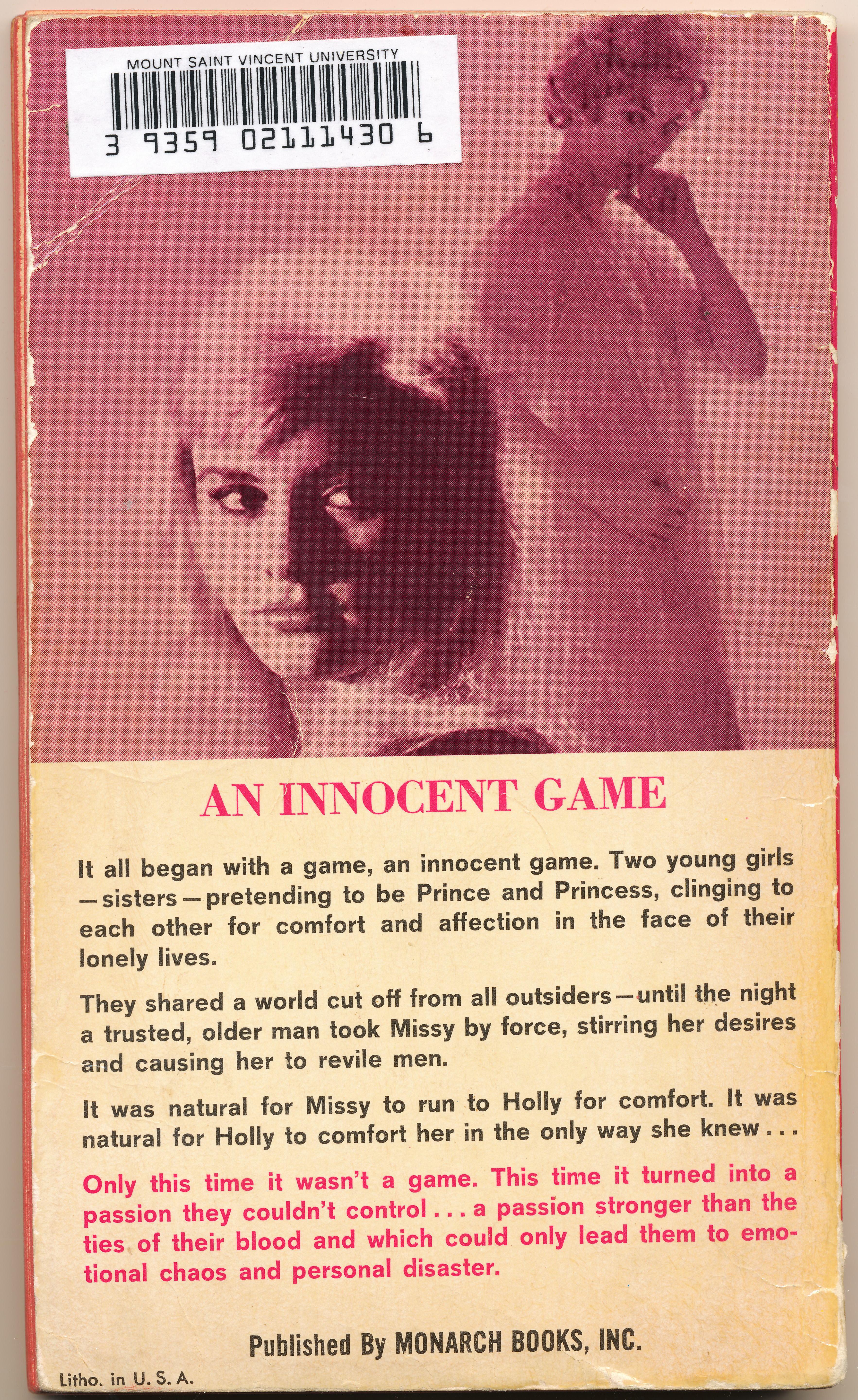"AN INNOCENT GAME. It all began with a game, an innocent game. Two young girls - sisters - pretending to be Prince and Princess, clinging to each other for comfort and affection in the face of their lonely lives. They shared a world cut off from all outsiders - until the night a trusted, older man took Missy by force, stirring her desires and causing her to revile men. It was natural for Missy to run to Holly for comfort. It was natural for Holly to comfort her in the only way she knew...Only this time it wasn't a game. This time it turned into a passion they couldn't control...a passion stronger than the ties of their blood and which could only lead them to emotional chaos and personal disaster.