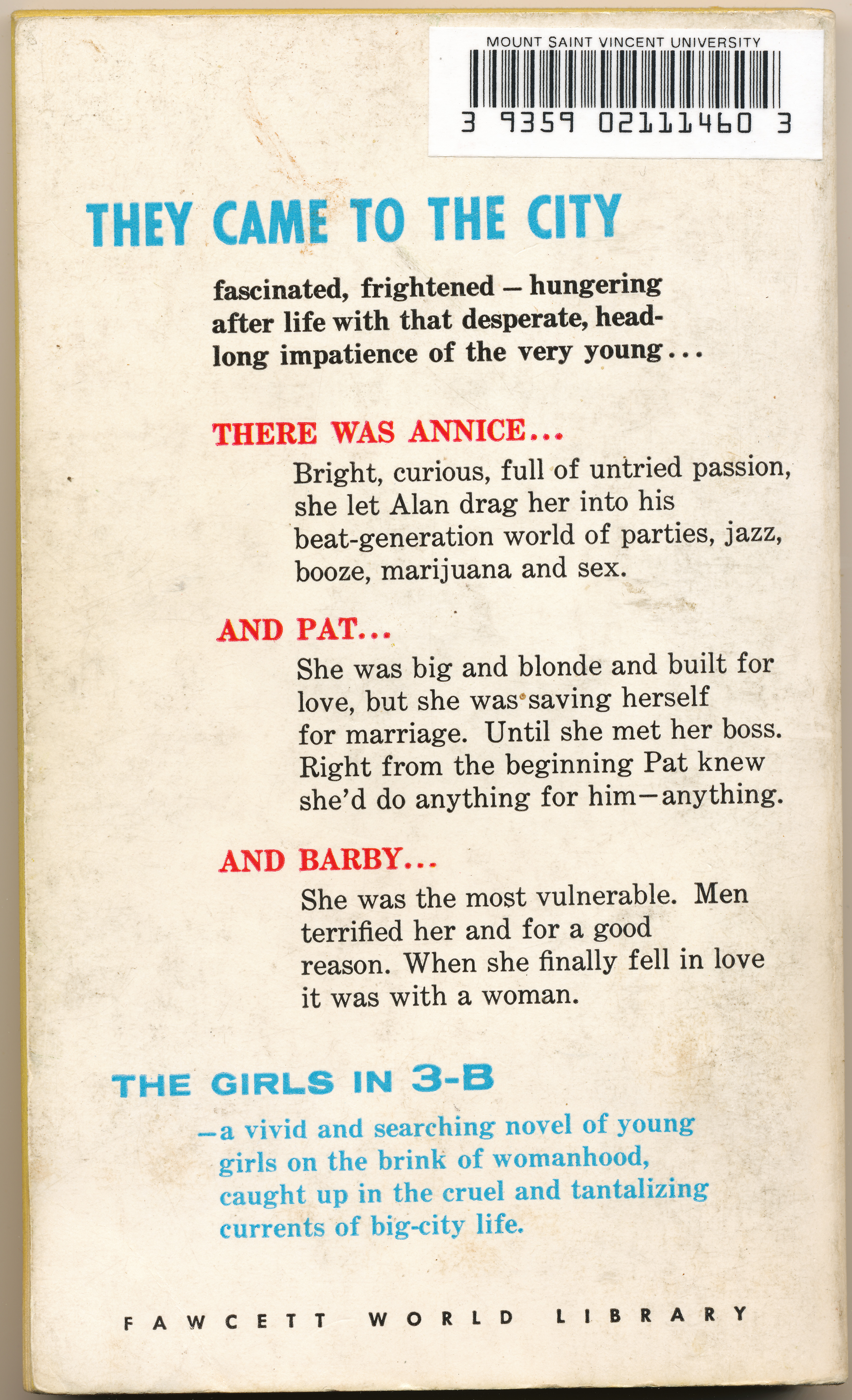 "THEY CAME TO THE CITY fascinated, frightened - hungering after life with that desperate, head-long impatience of the very young...There was Annice...Bright, curious, full of untried passions, she let Alan drag her into his beat-generation world of parties, jazz, booze, marijuana and sex. And Pat...She was big blonde and built for love, but she was saving herself for marriage. Until she met her boss. Right from the beginning Pat knew she'd do anything for him - anything. And Barby...She was the most vulnerable. Men terrified her and for a good reason. When she finally fell in love it was with a woman. THE GIRLS IN 3-B - a vivid and searching novel of young girls on the brink of womanhood, caught up in the cruel and tantalizing currents of big-city life." -Back cover