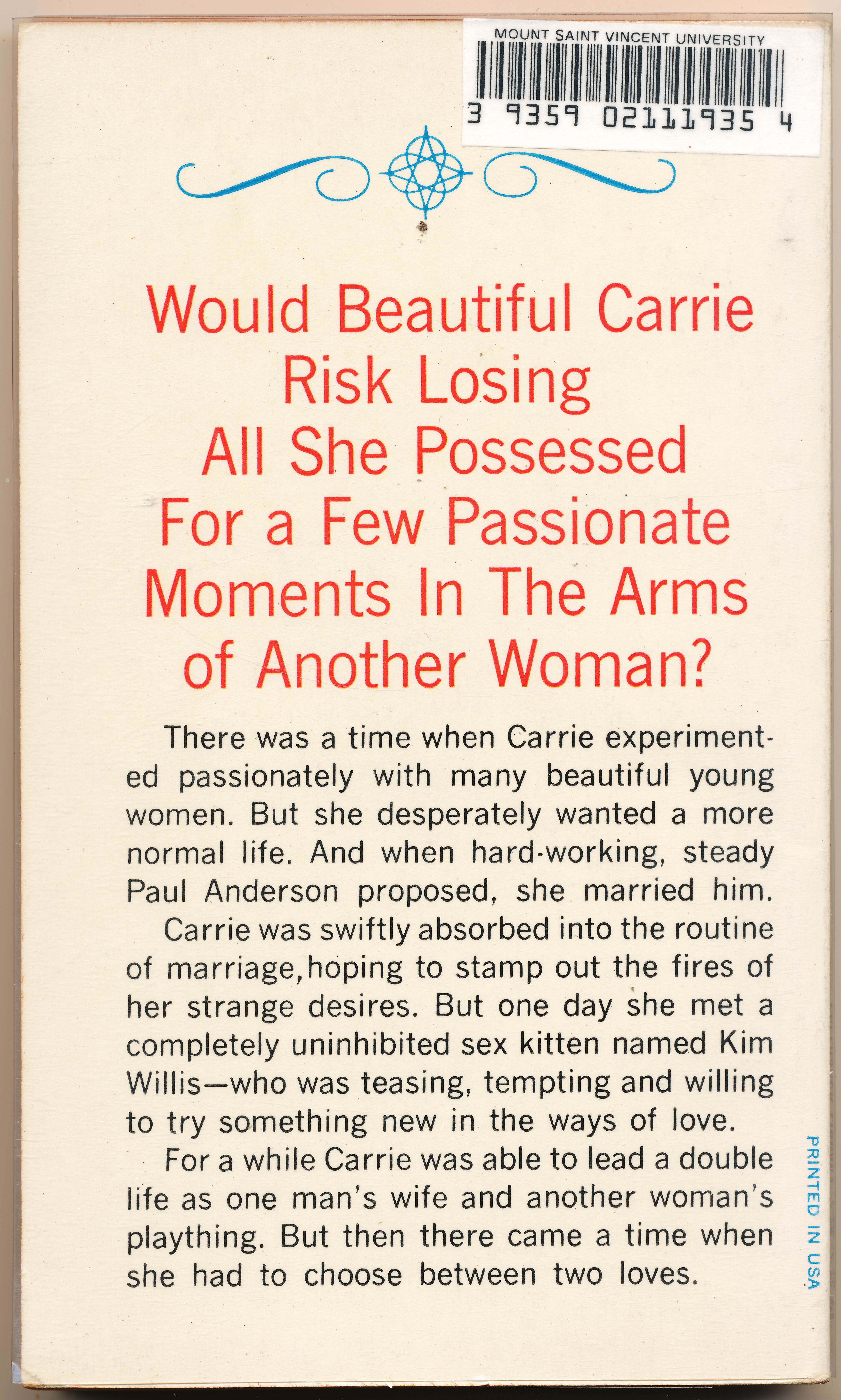 "Would beautiful Carrie risk losing all she possessed for a few passionate moments in the arms of another woman? There was a time when Carrie experimented passionately with many beautiful young women. But she desperately wanted a more normal life. And when hard-working steady Paul Anderson proposed, she married him. Carrie was swiftly absorbed into the routine of marriage, hoping to stamp out the fires of her strange desires. But one day she met a completely uninhibited sex kitten named Kim Willis - who was teasing, tempting and willing to try something new in the ways of love. For a while Carrie was able to lead a double life as one man's wife and another woman's plaything. But then there came a time when she had to choose between two loves." -Back cover