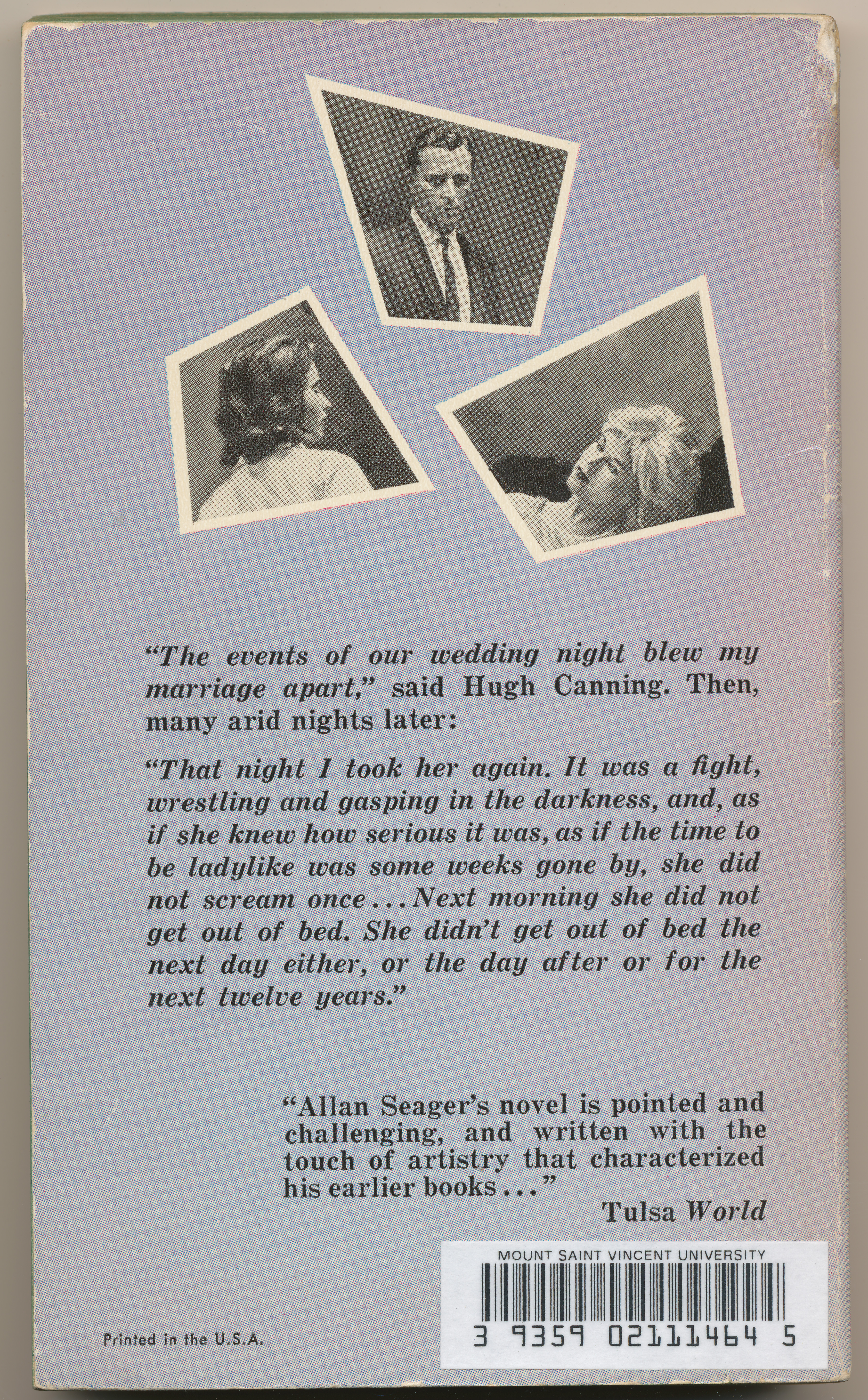 "'The events of our wedding night blew my marriage apart,' said Hugh Canning. Then, many arid nights later: 'That night I took her again. It was a fight, wrestling and gasping in the darkness, and, as if she knew how serious it was, as if the time to be ladylike was some weeks gone by, she did not scream once...Next morning she did not get out of bed. She didn't get out of bed the next day either, or the day after or for the next twelve years.' 'Allan Seager's novel is pointed and challenging, and written with the touch of artistry that characterized his earlier books...' -Tulsa World." -Back cover