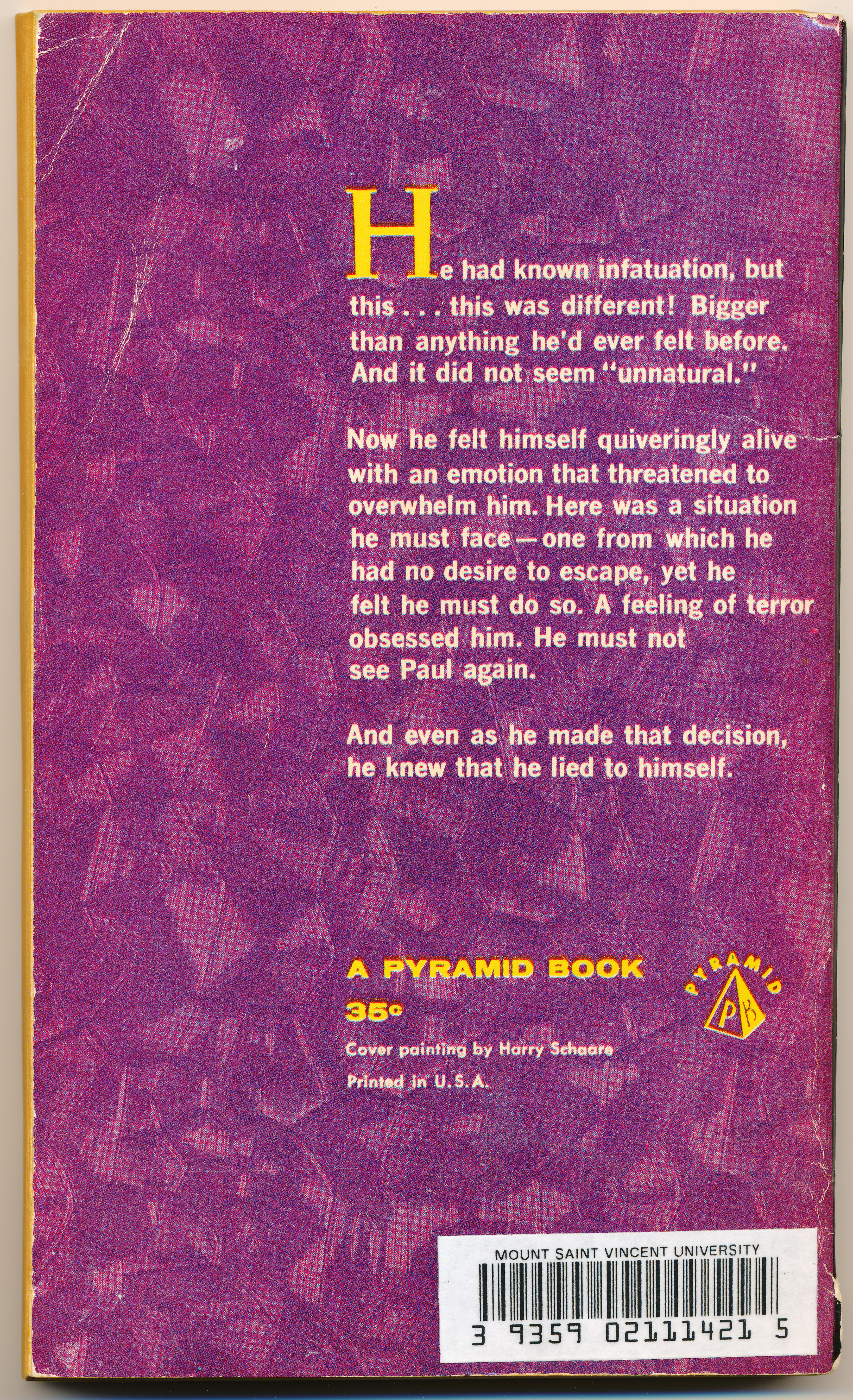 "He had known infatuation, but this...this was different! Bigger than anything he'd ever felt before. And it did not seem 'unnatural.' Now he felt himself quiveringly alive with an emotion that threatened to overwhelm him. Here was a situation he must face - one from which he had no desire to escape, yet he felt he must do so. A feeling of terror obsessed him. He must not see Paul again. And even as he made that decision, he knew that he lied to himself." -Back cover