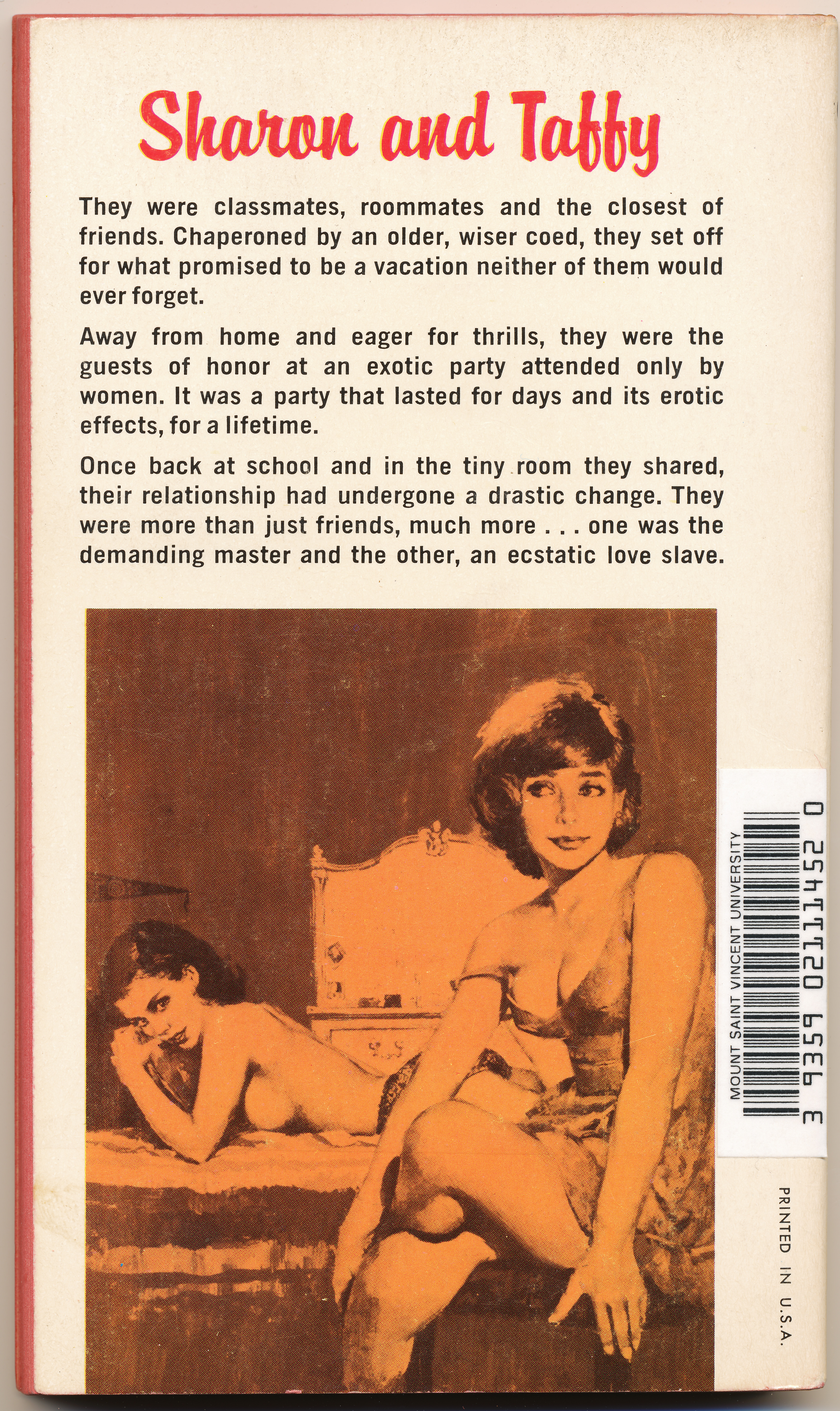 "SHARON AND TAFFY. They were classmates, roommates and the closest of friends. Chaperoned by an older, wiser coed, they set off for what promised to be a vacation neither of them would forget. Away from home and eager for thrills, they were the guests of honor at an exotic party attended only by women. It was a party that lasted for days and its erotic effects, for a lifetime. Once back at school and in the tiny room they shared, their relationship had undergone a drastic change. They were more than just friends, much more...one was the demanding master and the other, an ecstatic love slave." -Back cover