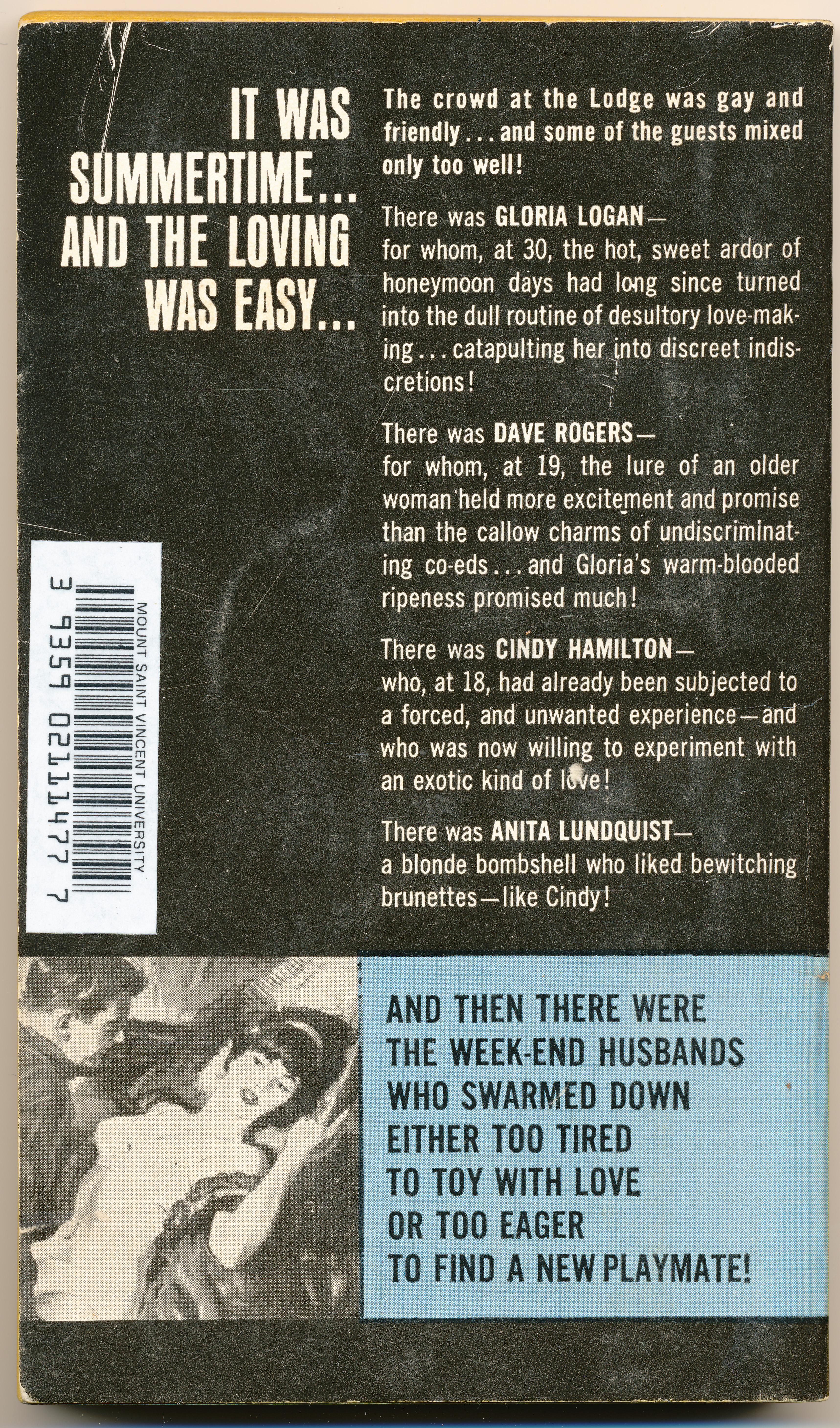 "IT WAS SUMMERTIME...AND THE LOVING WAS EASY...The crowd at the Lodge was gay and friendly...and some of the guests mixed too well! There was Gloria Logan - for whom, at 30, the hot, sweet ardor of honeymoon days had long since turned into the dull routine of desultory love-making...catapulting her into discreet indiscretions! There was Dave Rogers - for whom, at 19, the lure of an older woman held more excitement and promise than the callow charms of undiscriminating co-eds...and Gloria's warm-blooded ripeness promised much! There was Cindy Hamilton - who, at 18, had already been subjected to a forced, and unwanted experience - and who was now willing to experiment with an exotic kind of love! There was Anita Lundquist - a blonde bombshell who liked bewitching brunettes - like Cindy! And then there were the week-end husbands who swarmed down either too tired to toy with love or too eager to find a new playmate!" -Back cover
