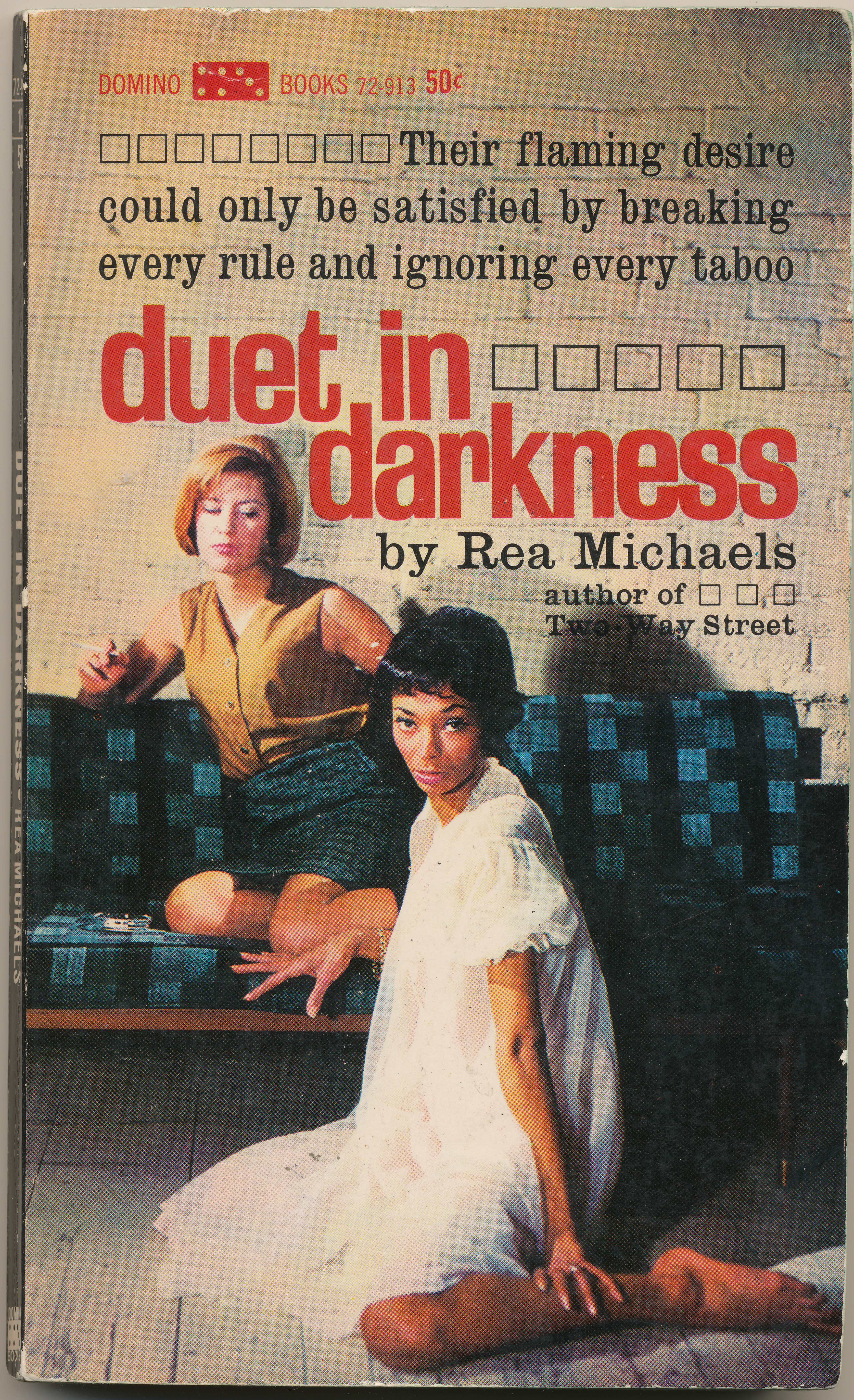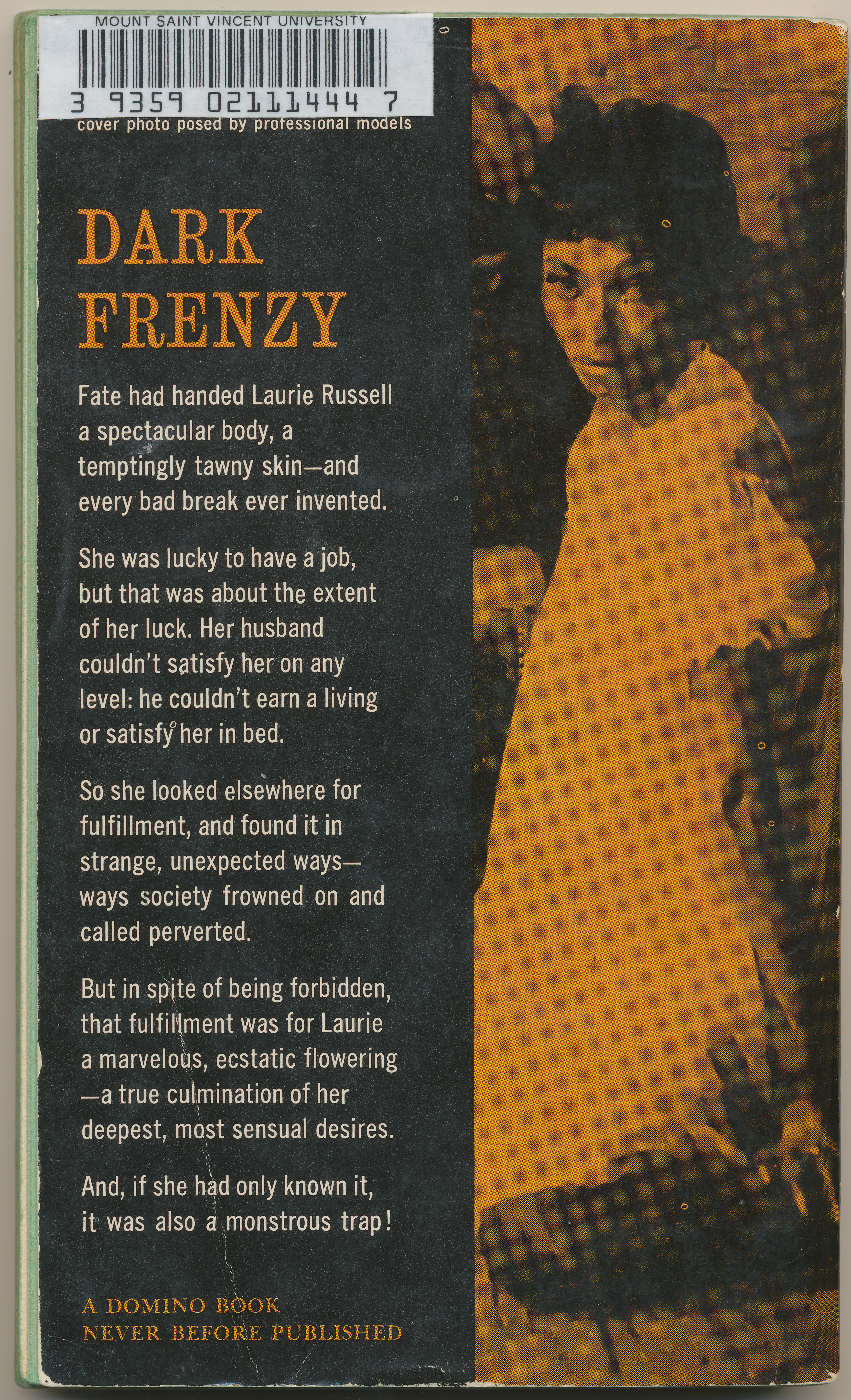 "DARK FRENZY. Fate had handed Laurie Russell a spectacular body, a temptingly tawny skin - and every bad break ever invented. She was lucky to have a job, but that was about the extent of her luck. Her husband couldn't satisfy her on any level: he couldn't earn a living or satisfy her in bed. So she looked elsewhere for fulfillment, and found it in strange, unexpected ways - ways society frowned on and called perverted. But in spite of being forbidden, that fulfillment was for Laurie a marvelous, ecstatic flowering - a true culmination of her deepest, most sensual desires. And if she had only know it, it was also a monstrous trap!" -Back cover