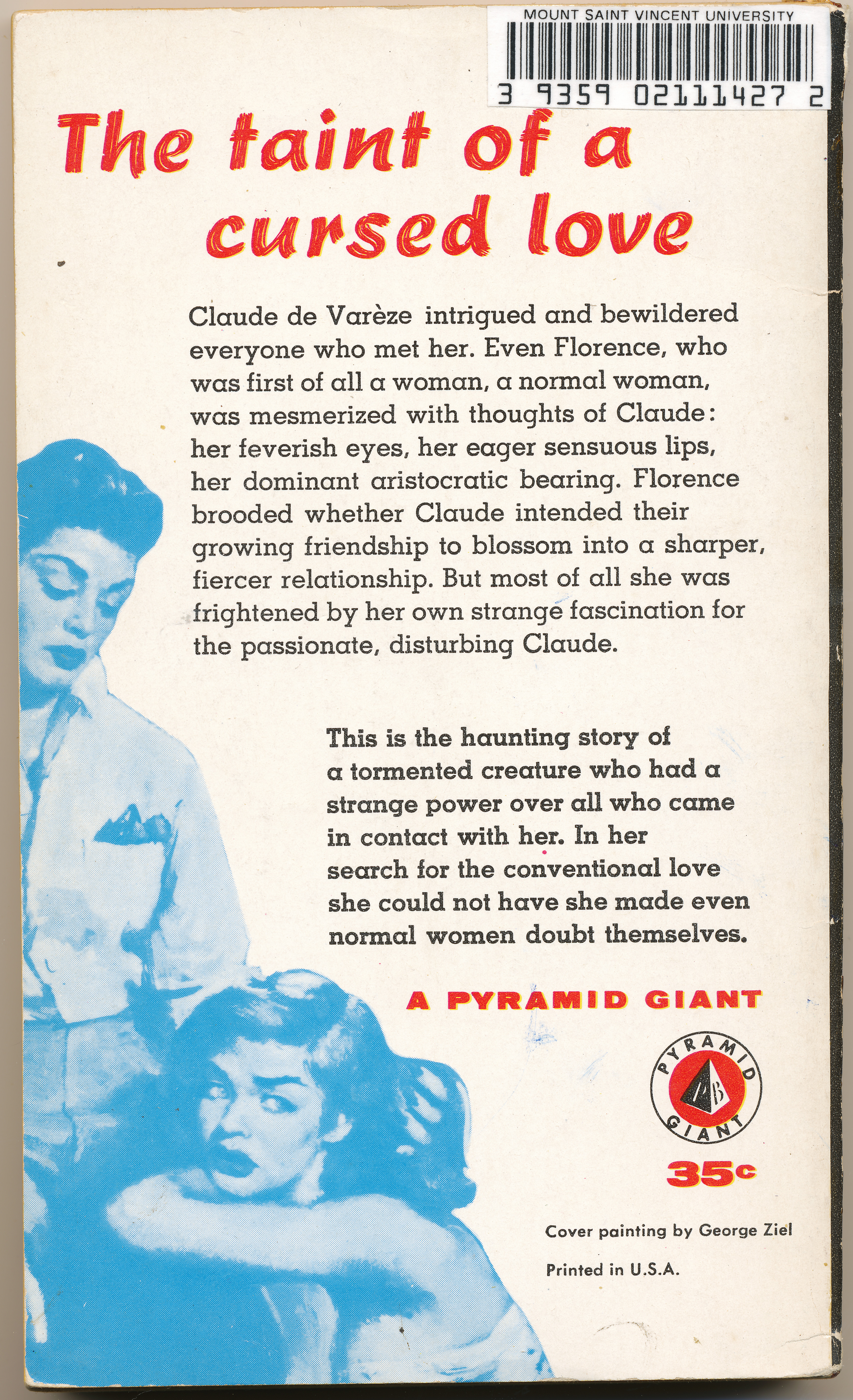 "THE TAINT OF A CURSED LOVE. Claude de Vareze intrigued and bewildered everyone who met her. Even Florence, who was first of all a woman, a normal woman, was mesmerized with thoughts of Claude: her feverish eyes, her eager sensuous lips, her dominant aristocratic bearing. Florence brooded whether Claude intended their growing friendship to blossom into a sharper, fiercer relationship. But most of all she was frightened by her own strange fascination for the passionate, disturbing Claude. This is the haunting story of a tormented creature who had a strange power over all who came in contact with her. In her search for the conventional love she could not have she made even normal women doubt themselves." -Back cover