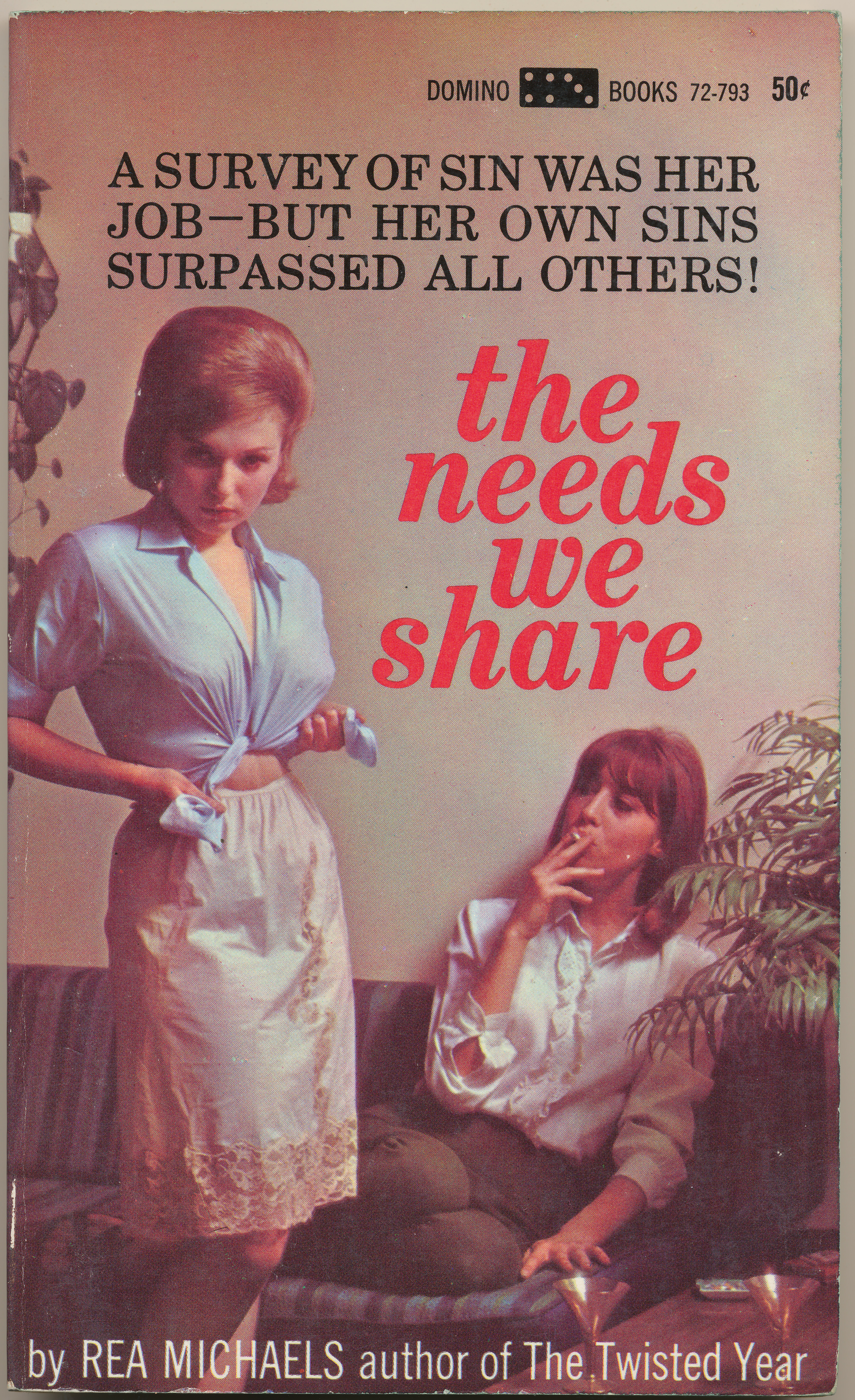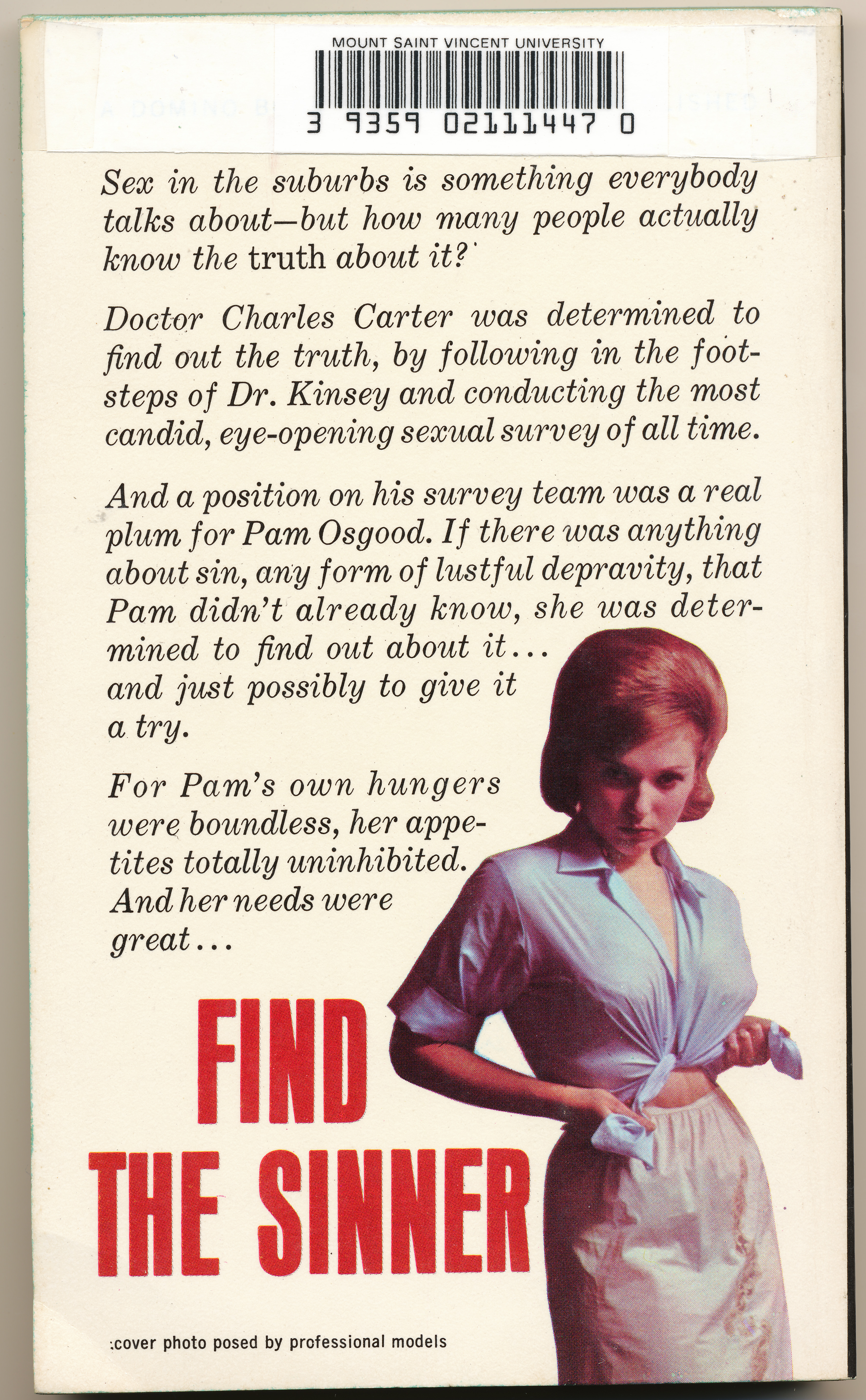 "Sex in the suburbs is something everybody talks about - but how many people actually know the truth about it? Doctor Charles Carter was determined to find out the truth, by following in the footsteps of Dr. Kinsey and conducting the most candid, eye-opening sexual surey of all time. And a position on his survey team was a real plum for Pam Osgood. If there was anything about sin, any form of lustful depravity, that Pam didn't already know, she was determined to find out about it...and just possibly to give it a try. For Pam's own hungers were boundless, her appetites totally uninhibited. And her needs were great...FIND THE SINNER." -Back cover