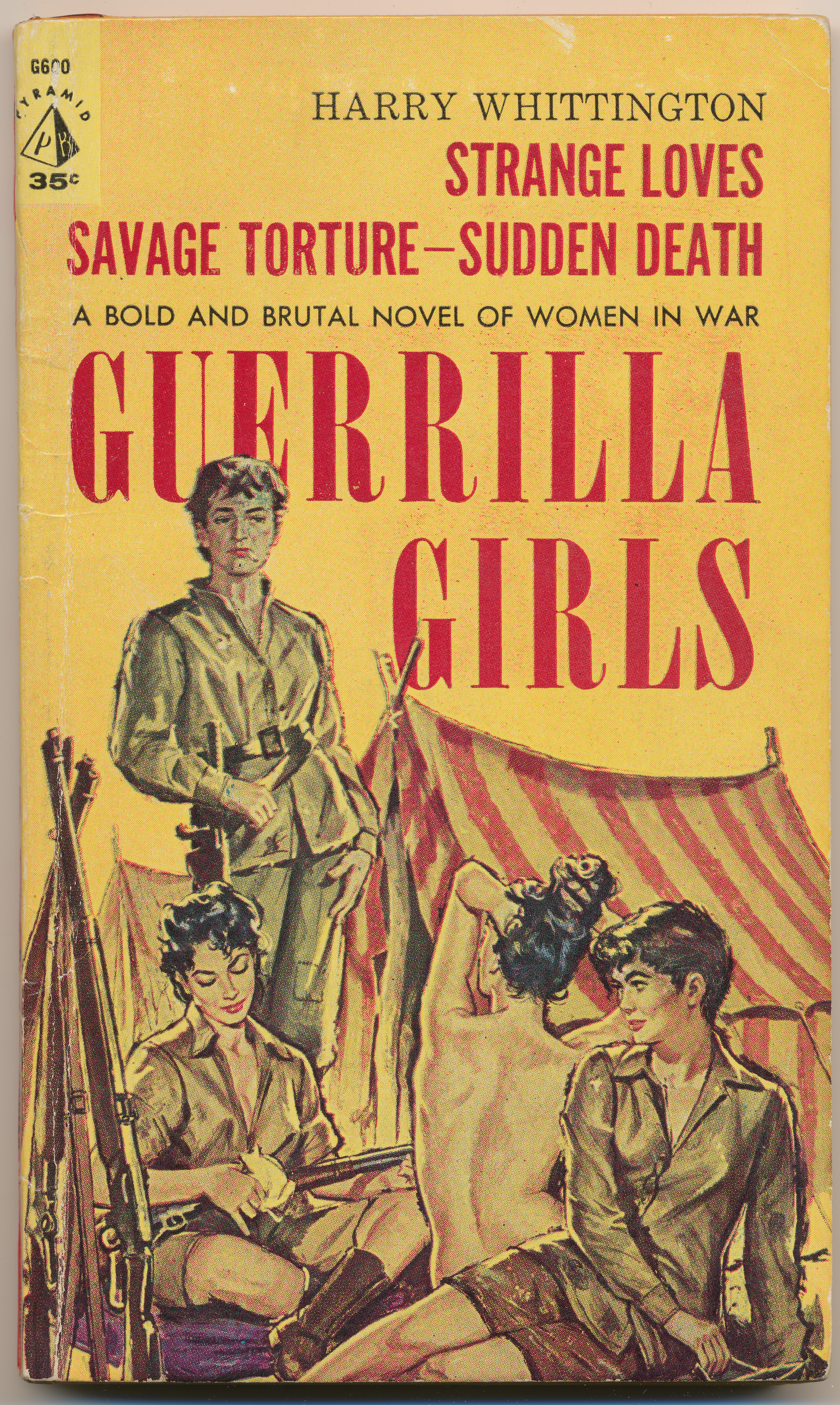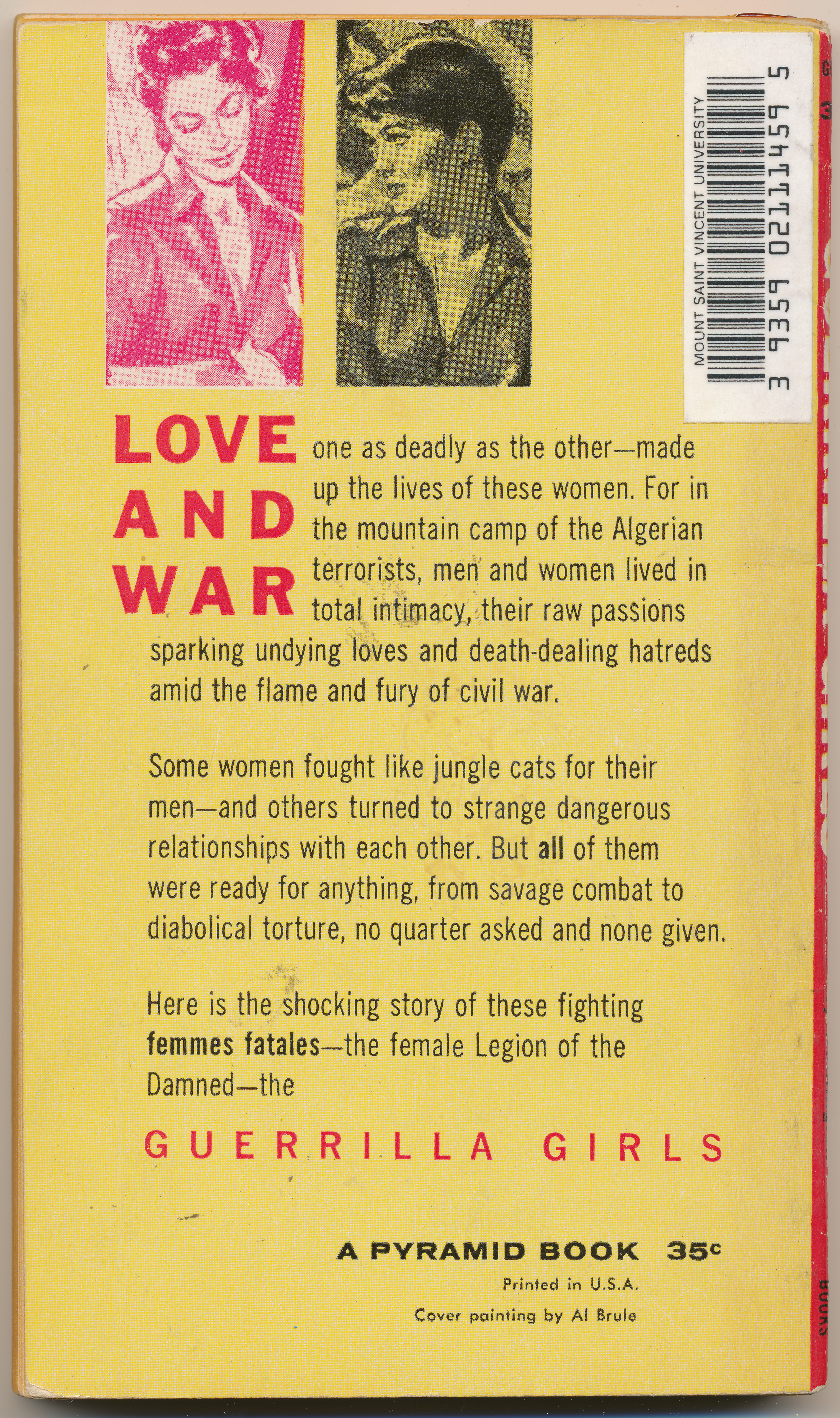"LOVE AND WAR one as deadly as the other - made up the lives of these women. For in the mountain camp of the Algerian terrorists, men and women lived in total intimacy, their raw passions sparking undying loves and death-dealing hatreds amid the flame and fury of civil war. Some women fought like jungle cats for their men - and others turned to strange dangerous relationships with each other. But all of them were ready for anything, from savage combat to diabolical torture, no quarter asked and none given. Here is the shocking story of these fighting femmes fatales - the female Legion of the Damned - the GUERRILLA GIRLS." -Back cover