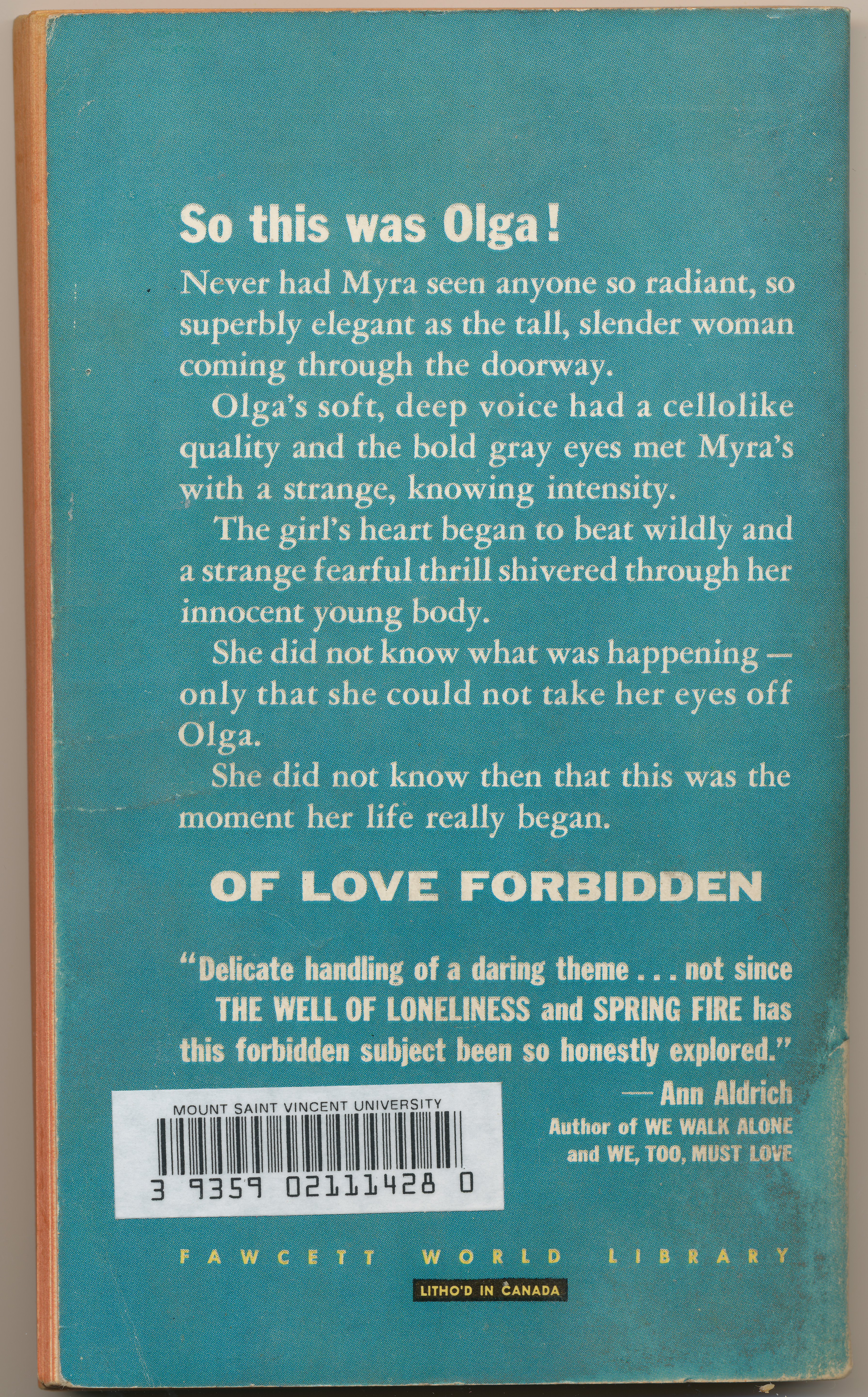 | dc.description | "So this was Olga! Never had Myra seen anyone so radiant, so superbly elegant as the tall, slender woman coming through the doorway. Olga's soft, deep voice had a cellolike quality and the bold gray eyes met Myra's with a strange, knowing intensity. The girl's heart began to beat wildly and a strange fearful thrill shivered through her innocent young body. She did not know what was happening - only that she could not take her eyes off Olga. She did not know then that this was the moment her life really began. 'Delicate handling of a daring them...not since The Well of Loneliness and Spring Fire has this forbidden subject been so honestly explored.' -Ann Aldrich" -Back cover | |