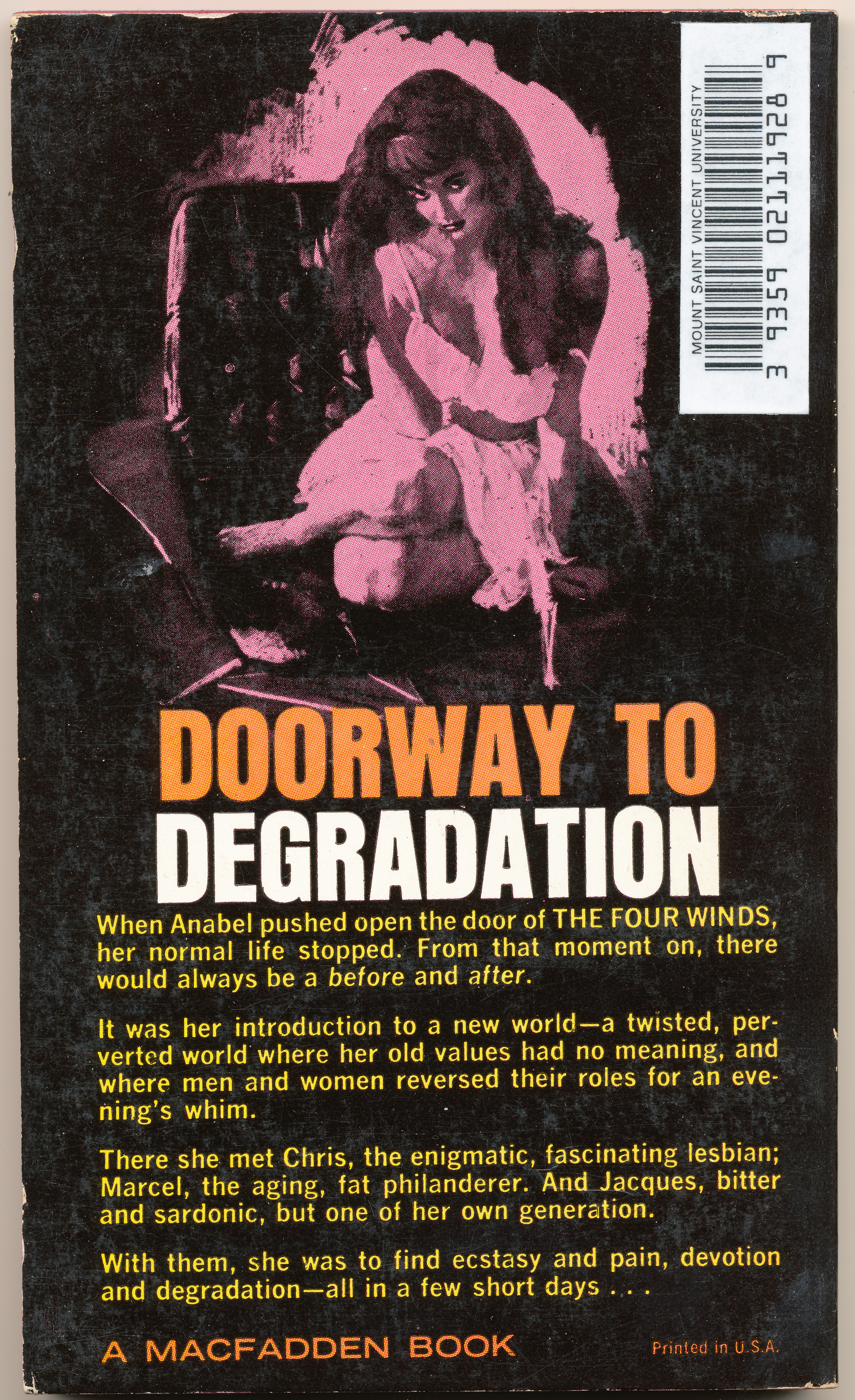 "DOORWAY TO DEGRADATION. When Anabel pushed open the door of 'The Four Winds,' her normal life stopped. From that moment on, there would always be a before and after. It was her introduction to a new world - a twisted, perverted world where her old values had no meaning, and where men and women reversed their roles for an evening's whim. There she met Chris, the enigmatic, fascinating lesbian; Marcel, the aging, fat philanderer. And Jacques, bitter and sardonic, but one of her own generation. With them, she was to find ecstacy and pain, devotion and degradation - all in a few short days..." -Back cover