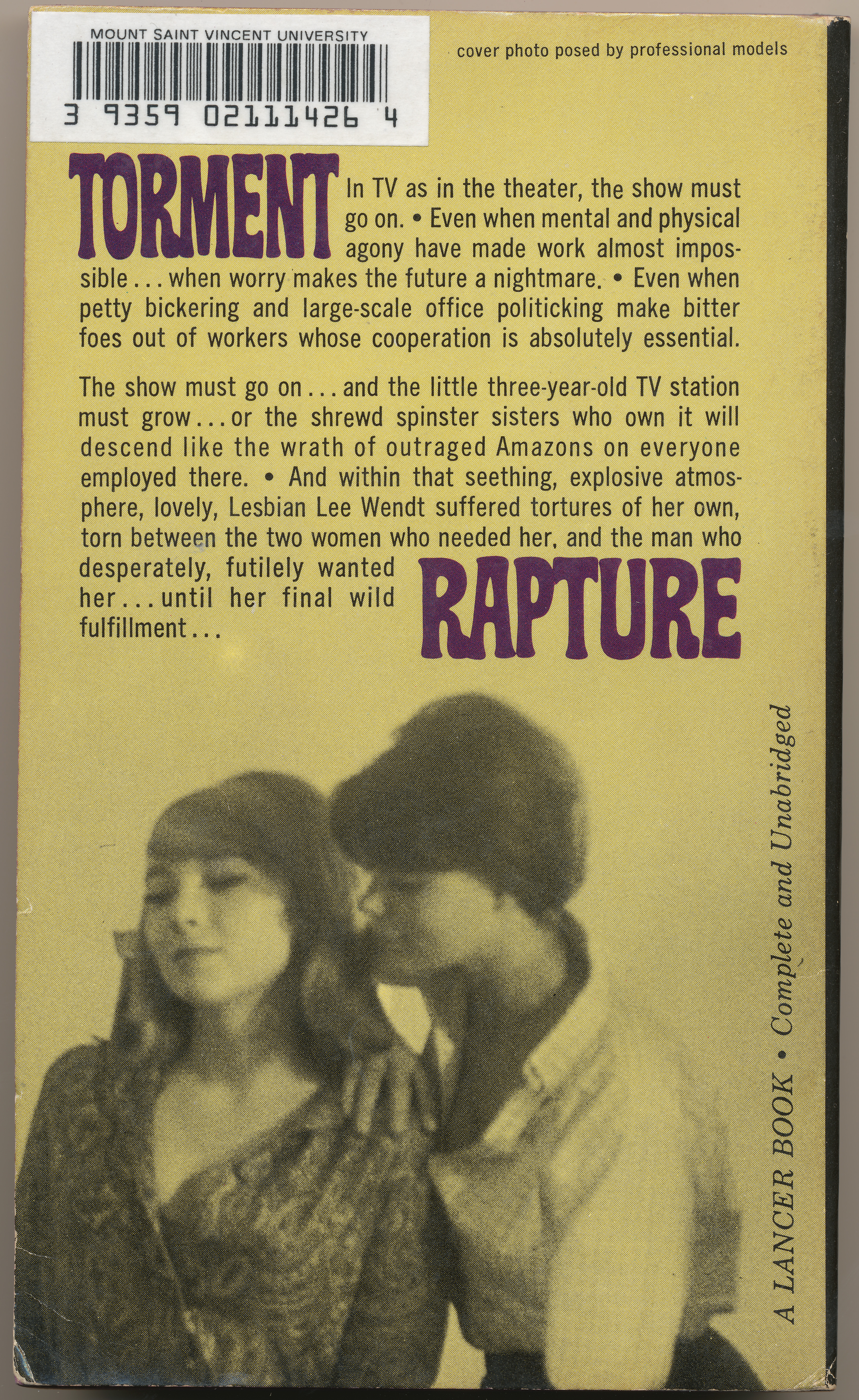 | dc.description | "TORMENT. In TV as in the theater, the show must go on. Even when mental and physical agony have made work almost impossible...when worry makes the future a nightmare. Even when petty bickering and large-scale office politicking make bitter foes out of workers whose cooperation is absolutely essential. The show must go on...and the little three-year-old TV station must grow...or the shrewd spinster sisters who own it will descend like the wrath of outraged Amazons on everyone employed there. And within that seeing, explosive atmosphere, lovely, Lesbian Lee Wendt suffered tortures of her own, torn between the two women who needed her, and the man who desperately, futilely wanted her...until her final wild fulfillment...RAPTURE." -Back cover | |