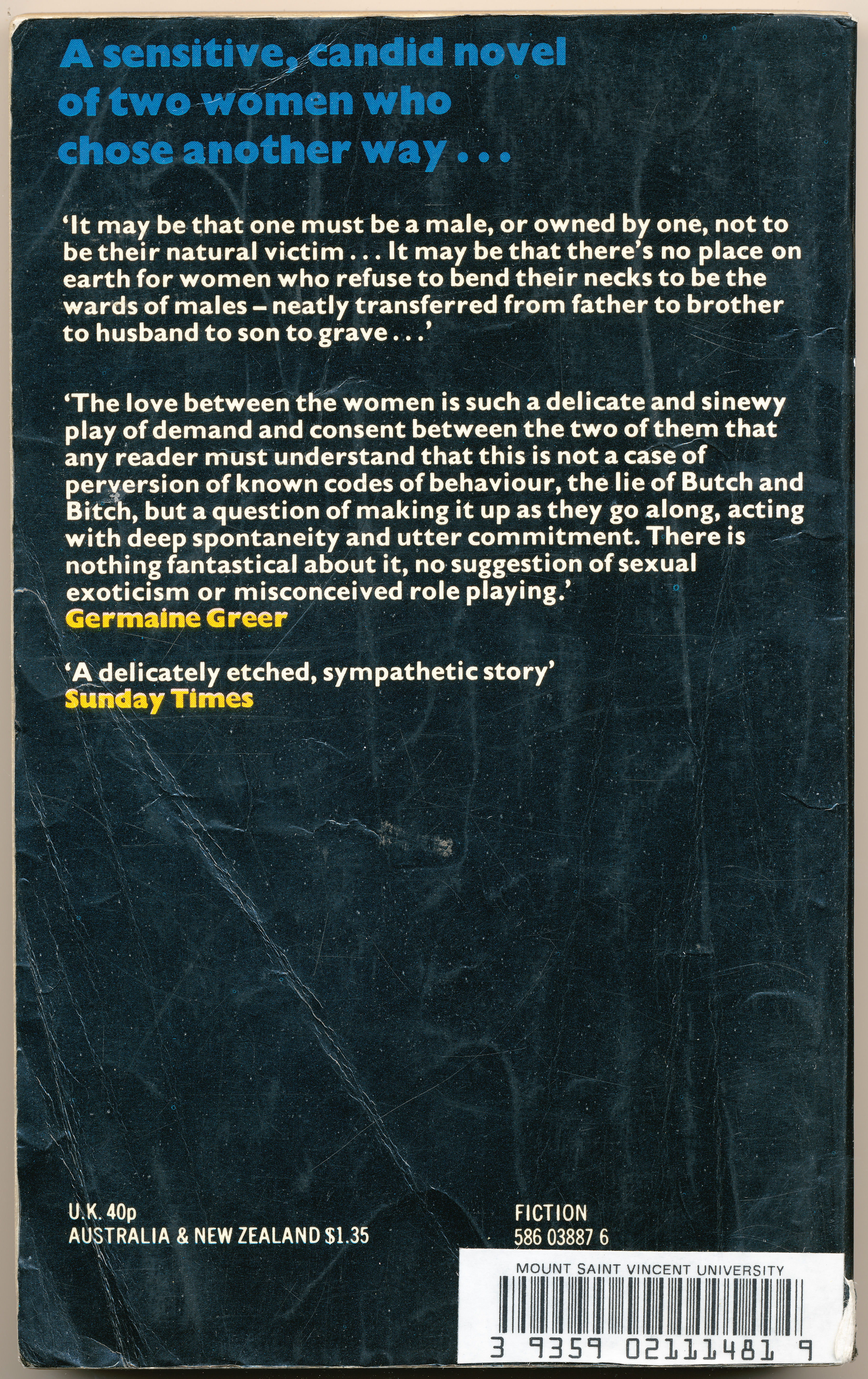 "A sensitive, candid novel of two who chose another way...'It may be that one must be a male, or owned by one, not to be their natural victim...It may be that there's no place on earth for women who refuse to bend their necks to be the ward of males - neatly transferred from father to brother to husband to son to grave...''The love between the women is such a delicate and sinewy play of demand and consent between the two of them that any reader must understand that this is not a case of perversion of known codes of behaviour, the lie of Butch and Bitch, but a question of making it up as they go along, acting with deep spontaneity and utter commitment. There is nothing fantastical about it, no suggestion of sexual exoticism or misconceived role playing.' -Germaine Greer. 'A delicately etched, sympathetic story' -Sunday Times." -Back cover